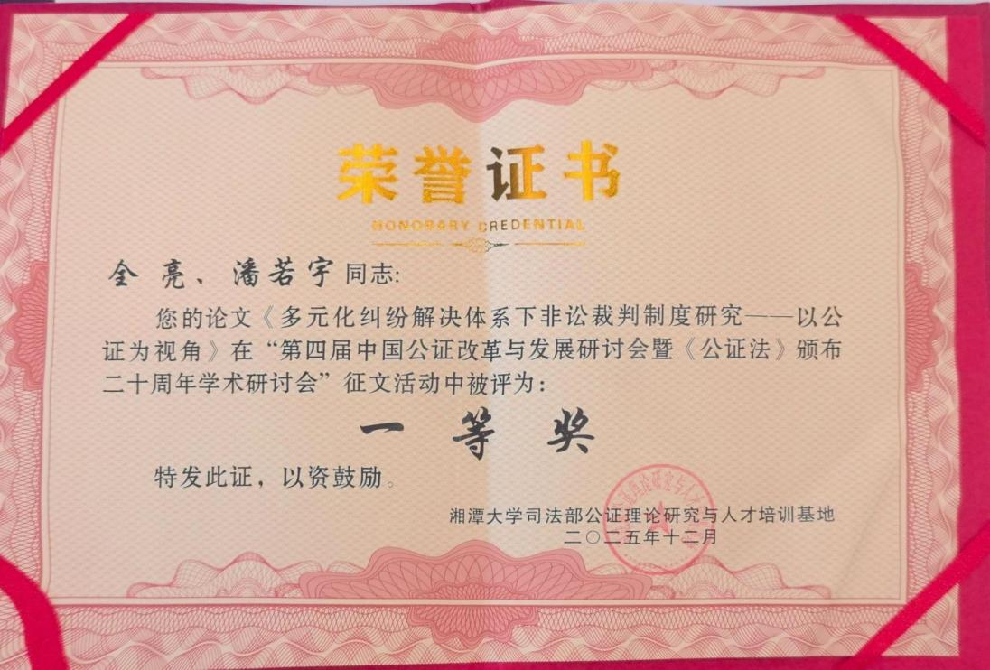 在本次会议征文的颁奖活动中,全亮教授和2021级硕士生潘若宇(现为西南政法大学2024级博士生)共同撰写的参会论文《多元化纠纷解决体系下非讼裁判制度研究——以公证为视角》荣获得一等奖。