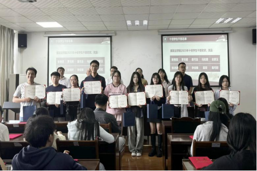 余华宣读表彰决定,授予靳茜雯等10名同学“2025年十佳学生干部”荣誉称号,领导及老师为其颁发奖状和奖品。