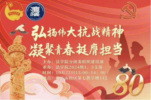 10月22日,法学院“弘扬伟大抗战精神,凝聚青春挺膺担当”为主题的校级团组织生活观摩活动在狮子山校区第七教学楼112教室举行。校团委书记杨经纬,法学院党委副书记、纪委书记李瑾,法学院学生工作办公室主任、分团委书记熊胤,2023级辅导员瞿洁,2024级辅导员张杰,2025级辅导员罗梅,校团委、各兄弟学院组建部代表,法学院其他年级学生代表及2024级第1支部和第3支部全体学生参与本次活动。