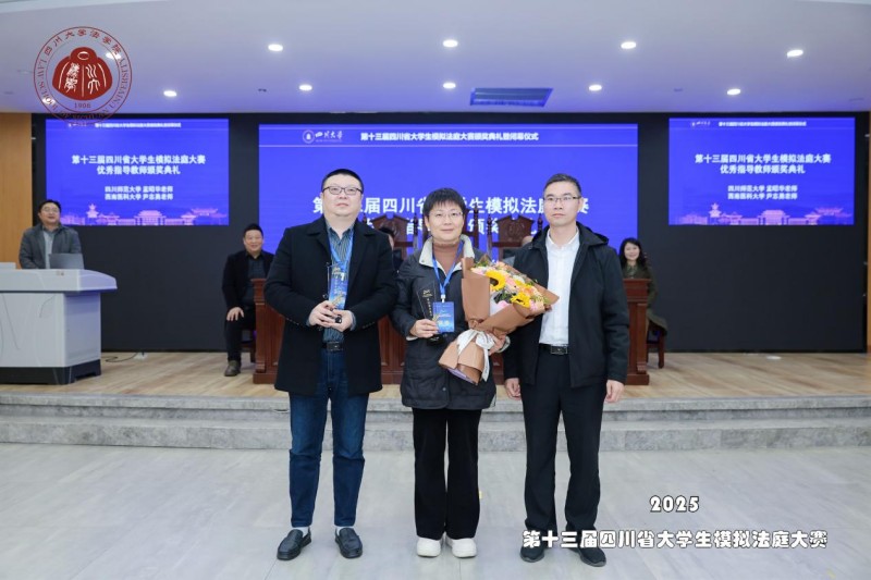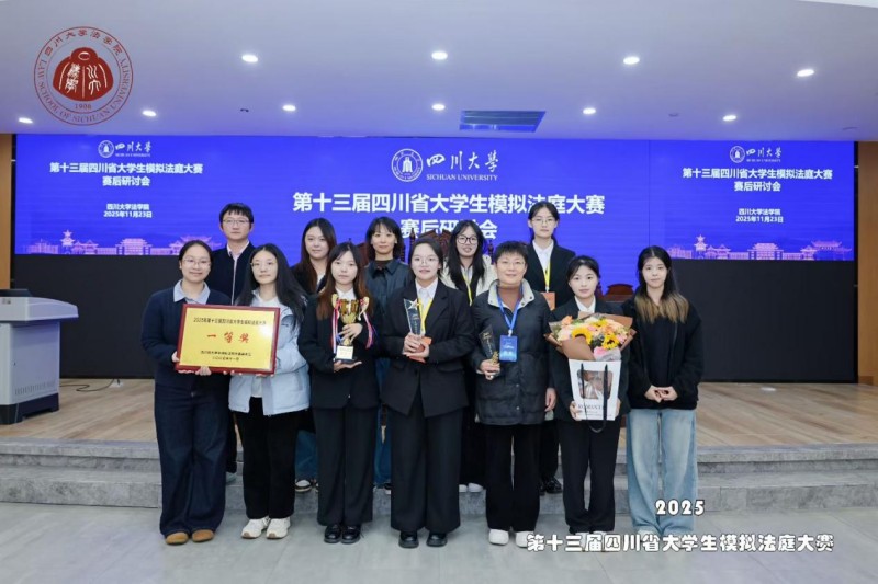 2025年11月21日至23日,由四川省教育厅主办、四川大学承办的第十三届四川省大学生模拟法庭大赛于四川大学江安校区法学院进行。由法学院2023级本科生李诗婷、戴罗曼、高馨语、王敏、黄欣、蒋文欣、蒋燕岭和冷冰洁共8名成员组成的四川师范大学代表队六战六捷、一举夺魁(冠军、一等奖)!本项赛事自创办以来一共举办13届,我校代表队6次夺冠,并达成了三度蝉联赛事冠军(2016-2017、2019-2020、2024-2025)的创纪录成就,是本赛事中成绩最好的高校!