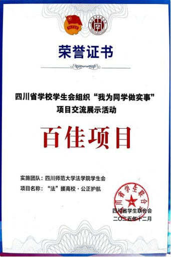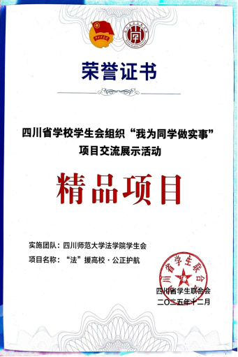 法学院学生会在学院党委的坚强领导下,在学院分团委的具体指导下,逐步形成了“五抓五力”的工作方法,以实际行动践行服务同学的宗旨,不断推动学生会组织以务实举措助力同学成长。本次“‘法’援高校·公正护航”项目也是继续“立命民生 缘法而行”之后法学院团学工作打造出的又一品牌项目,实现了我院在四川省学校学生会组织“我为同学做实事”项目活动中获奖零的突破。