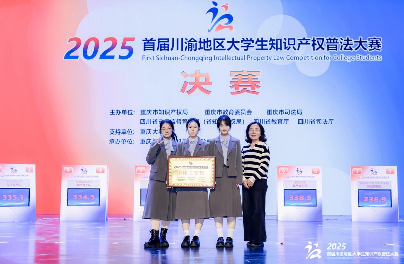 2025年12月6日,由川渝两地知识产权、教育、司法行政部门共同主办的首届川渝地区大学生知识产权普法大赛决赛在重庆大学沙坪坝校区圆满收官。法学院2023级本科生庞雨佳、刘海燕、曾佳怡共3名成员组成的四川师范大学代表队凭借预赛阶段的优异表现从包括重庆大学、西南政法大学、西南大学、重庆理工大学、重庆交通大学、西南交通大学、四川师范大学、四川司法警官职业学院、西华师范大学、西华大学等在内的118所参赛高校中突围晋级,决赛场上稳扎稳打斩获团体三等奖,庞雨佳同学以四川省预赛第一名的优异成绩荣获“优秀个人奖”。四川师范大学代表队由法学院杨小兰教授担任随队指导老师。